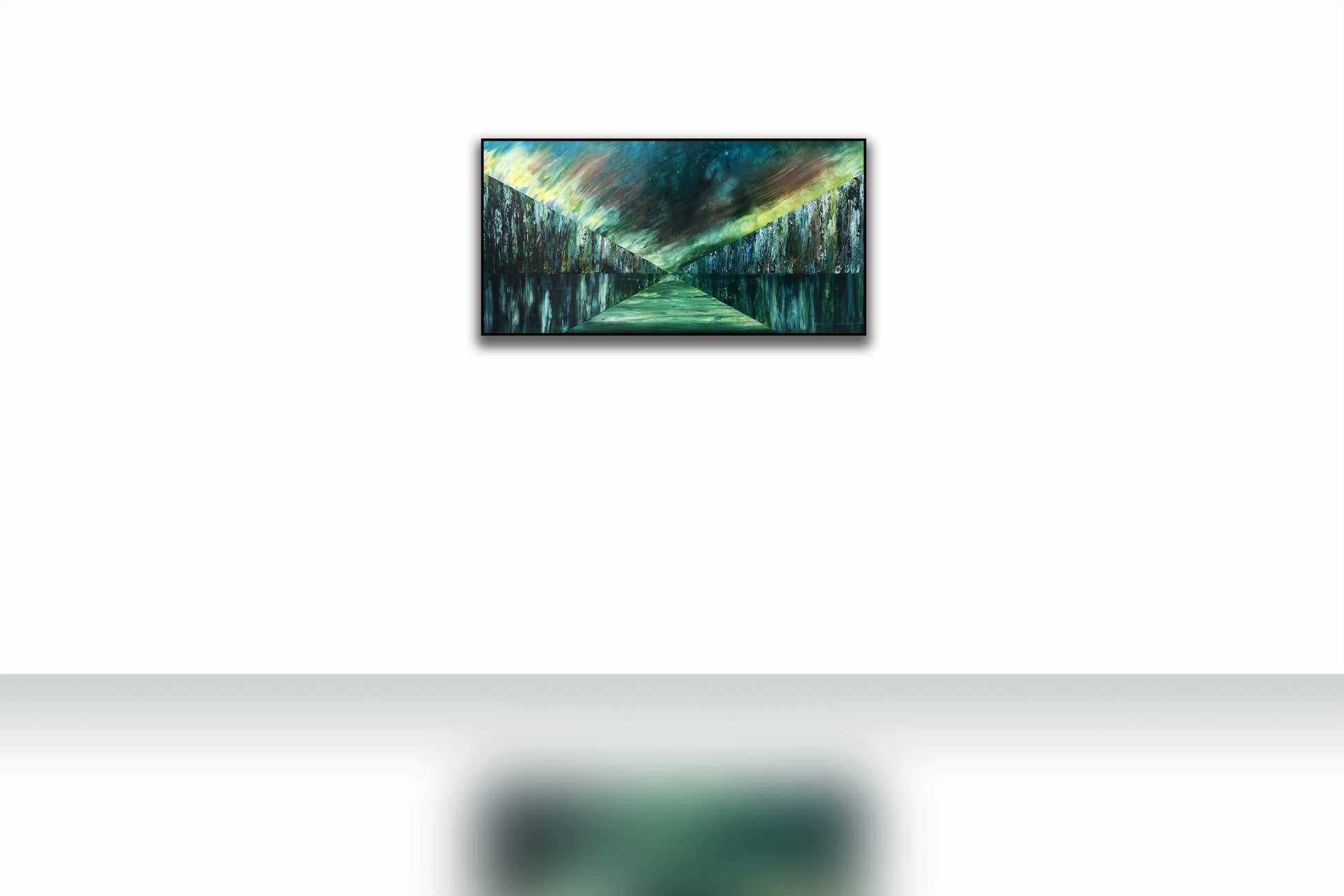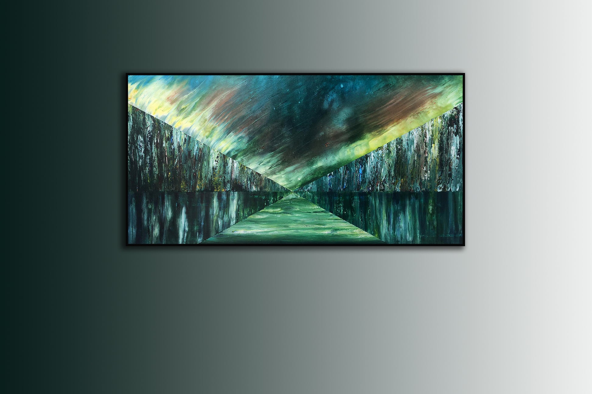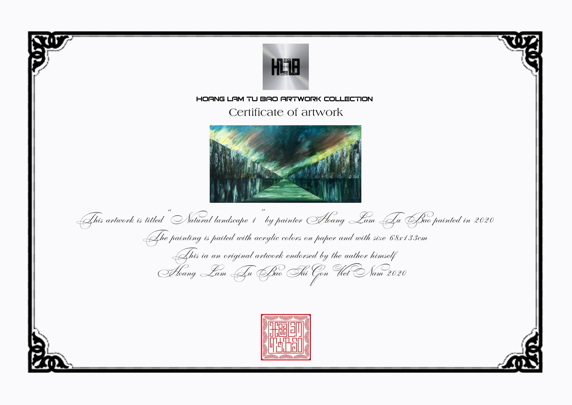 Dưới tiêu đề “Âm vang đất trời”, bức tranh mở ra một không gian siêu thực, nơi thiên nhiên không chỉ hiện hữu mà còn cất lên tiếng nói nội tâm đầy mê hoặc. Với bố  cục đối xứng như tấm gương phản chiếu vũ trụ, từng nét cọ mạnh mẽ và màu sắc chuyển động như những nốt nhạc đang ngân vang trong bản giao hưởng của đất  trời. Phía trên là bầu trời cuộn xoáy sắc xanh, vàng, nâu và lam tựa như những tầng mây đang nhảy múa trong cơn gió vô hình. Phía dưới là mặt nước phản chiếu tất  cả, không chỉ là hình ảnh mà còn là cảm xúc, như thể thiên nhiên đang đối thoại với chính mình. Những vệt màu dựng đứng gợi hình ảnh rừng sâu hay thác đổ, tạo nên  cảm giác vừa hùng vĩ vừa linh thiêng. Không gian trong tranh không bị giới hạn bởi thời gian hay địa lý. Nó là nơi mà con người có thể lắng nghe tiếng vọng của vũ trụ, cảm nhận sự kết nối giữa cái hữu hình  và cái vô hình. “Âm vang đất trời” không chỉ là một cảnh vật, mà là một trạng thái tâm hồn nơi thiên nhiên trở thành bản thể sống, biết thở, biết nói, và biết ngân vang.
