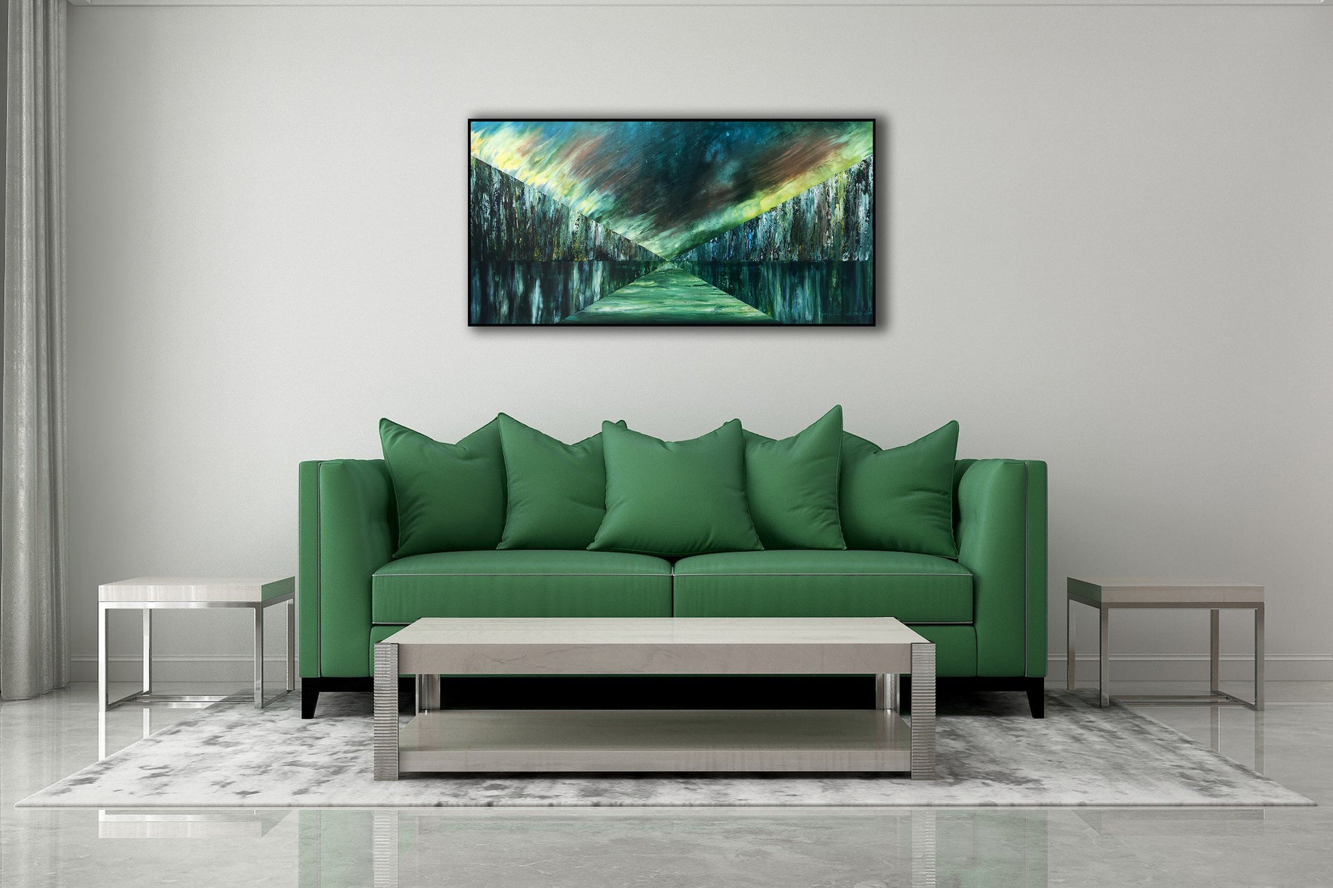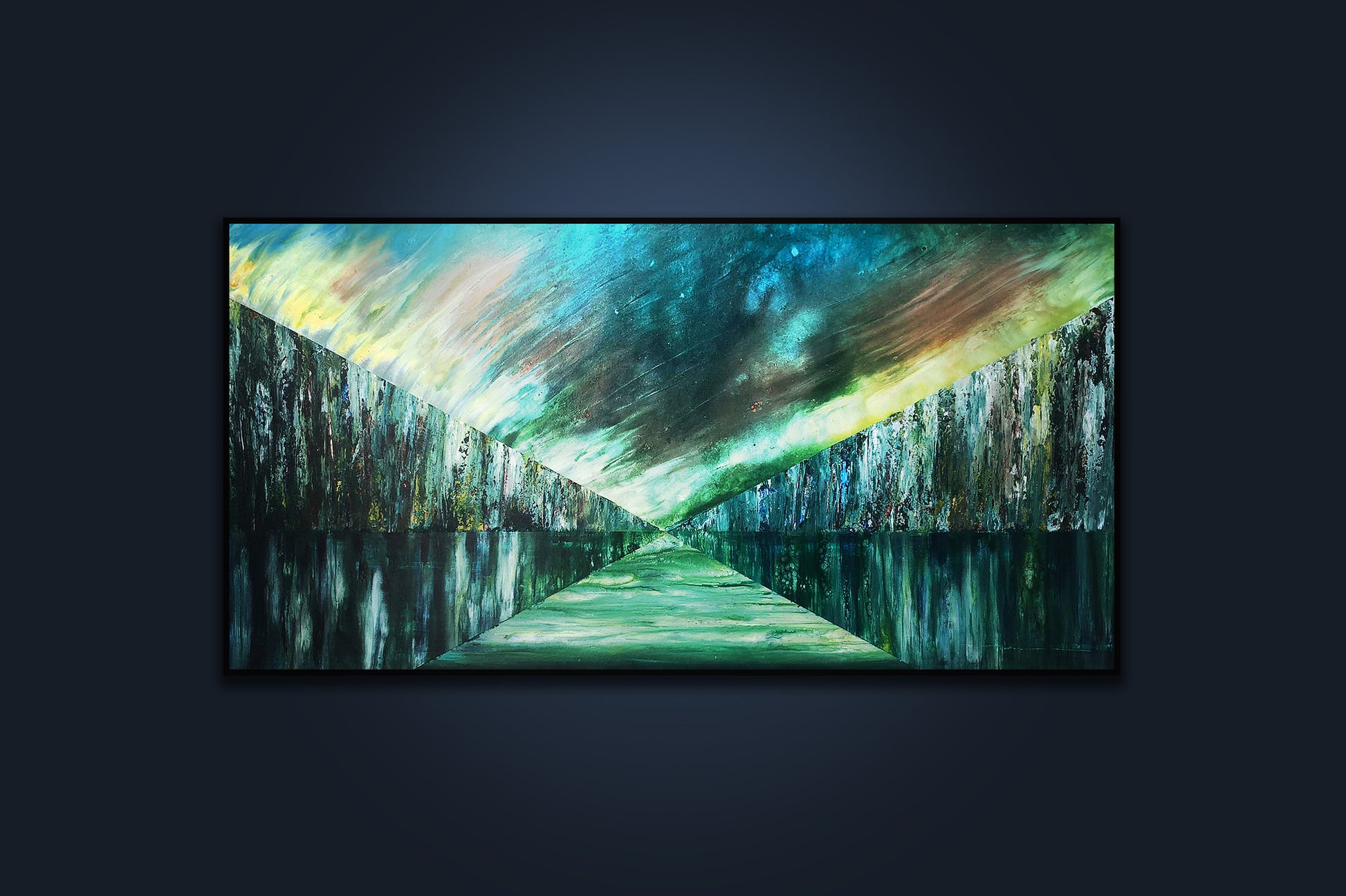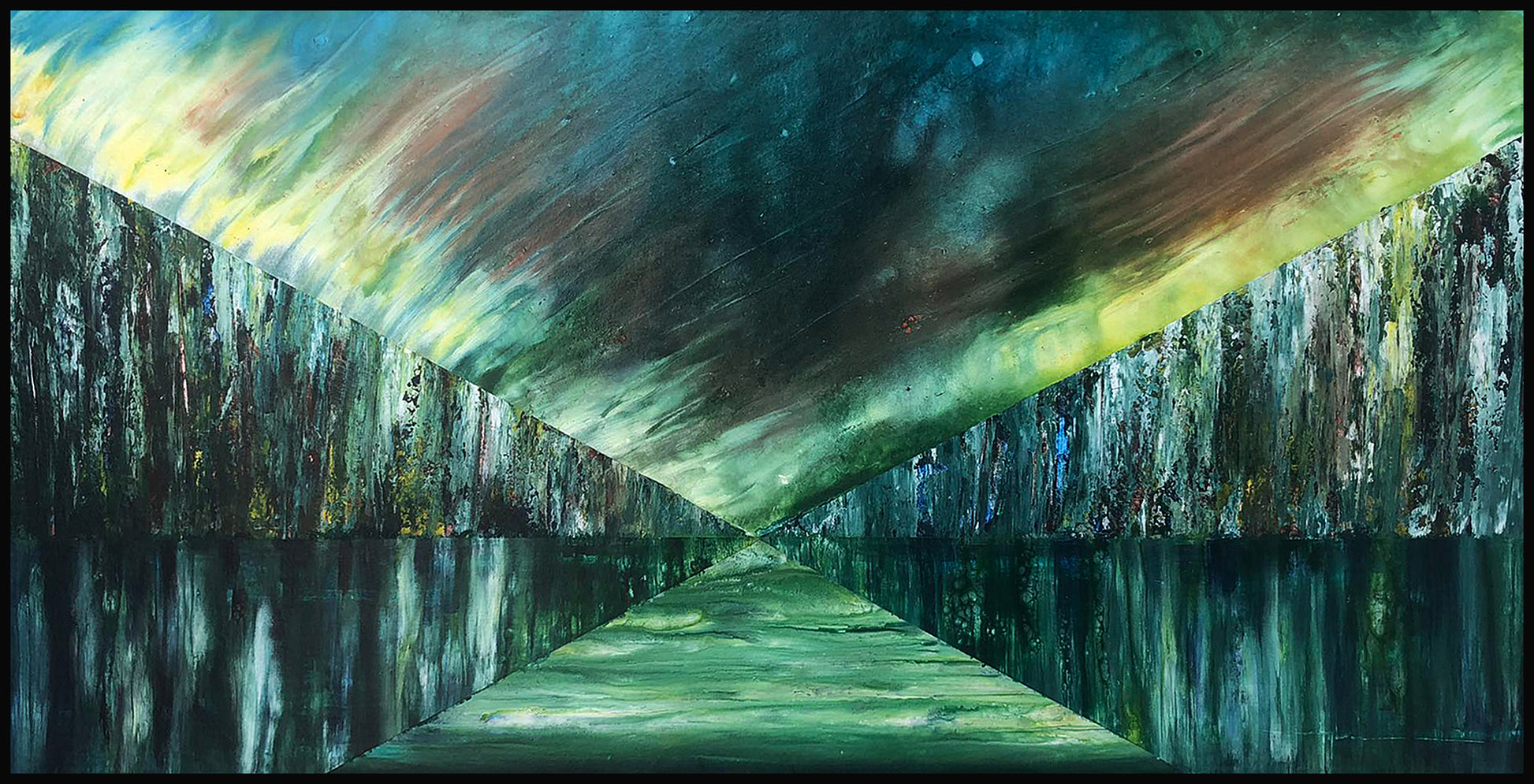 Dưới tiêu đề “Âm vang đất trời”, bức tranh mở ra một không gian siêu thực, nơi thiên nhiên không chỉ hiện hữu mà còn cất lên tiếng nói nội tâm đầy mê hoặc. Với bố  cục đối xứng như tấm gương phản chiếu vũ trụ, từng nét cọ mạnh mẽ và màu sắc chuyển động như những nốt nhạc đang ngân vang trong bản giao hưởng của đất  trời. Phía trên là bầu trời cuộn xoáy sắc xanh, vàng, nâu và lam tựa như những tầng mây đang nhảy múa trong cơn gió vô hình. Phía dưới là mặt nước phản chiếu tất  cả, không chỉ là hình ảnh mà còn là cảm xúc, như thể thiên nhiên đang đối thoại với chính mình. Những vệt màu dựng đứng gợi hình ảnh rừng sâu hay thác đổ, tạo nên  cảm giác vừa hùng vĩ vừa linh thiêng. Không gian trong tranh không bị giới hạn bởi thời gian hay địa lý. Nó là nơi mà con người có thể lắng nghe tiếng vọng của vũ trụ, cảm nhận sự kết nối giữa cái hữu hình  và cái vô hình. “Âm vang đất trời” không chỉ là một cảnh vật, mà là một trạng thái tâm hồn nơi thiên nhiên trở thành bản thể sống, biết thở, biết nói, và biết ngân vang.
