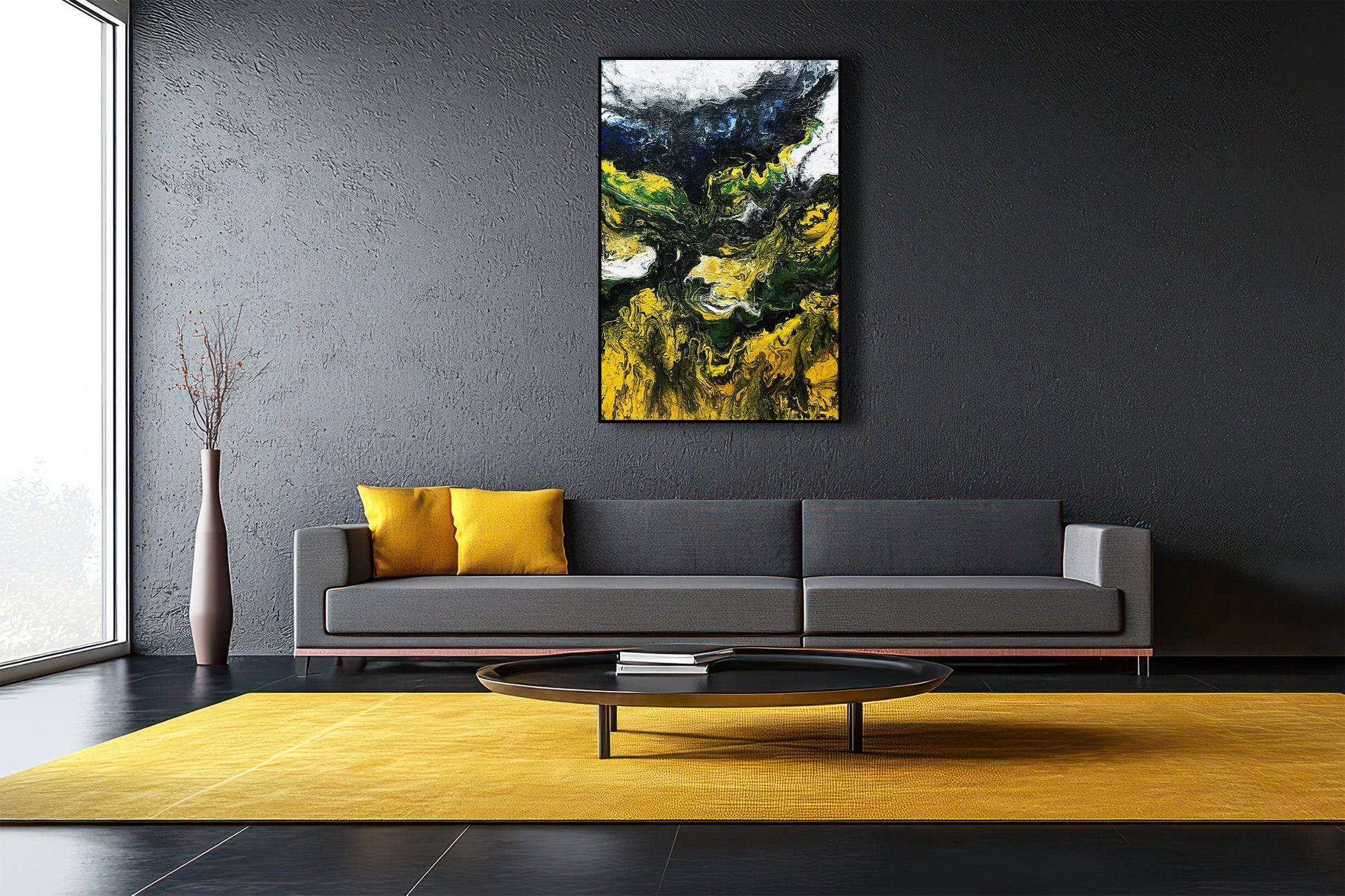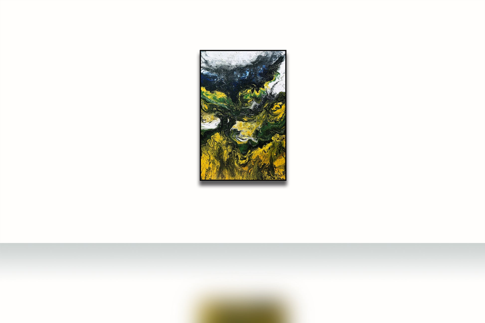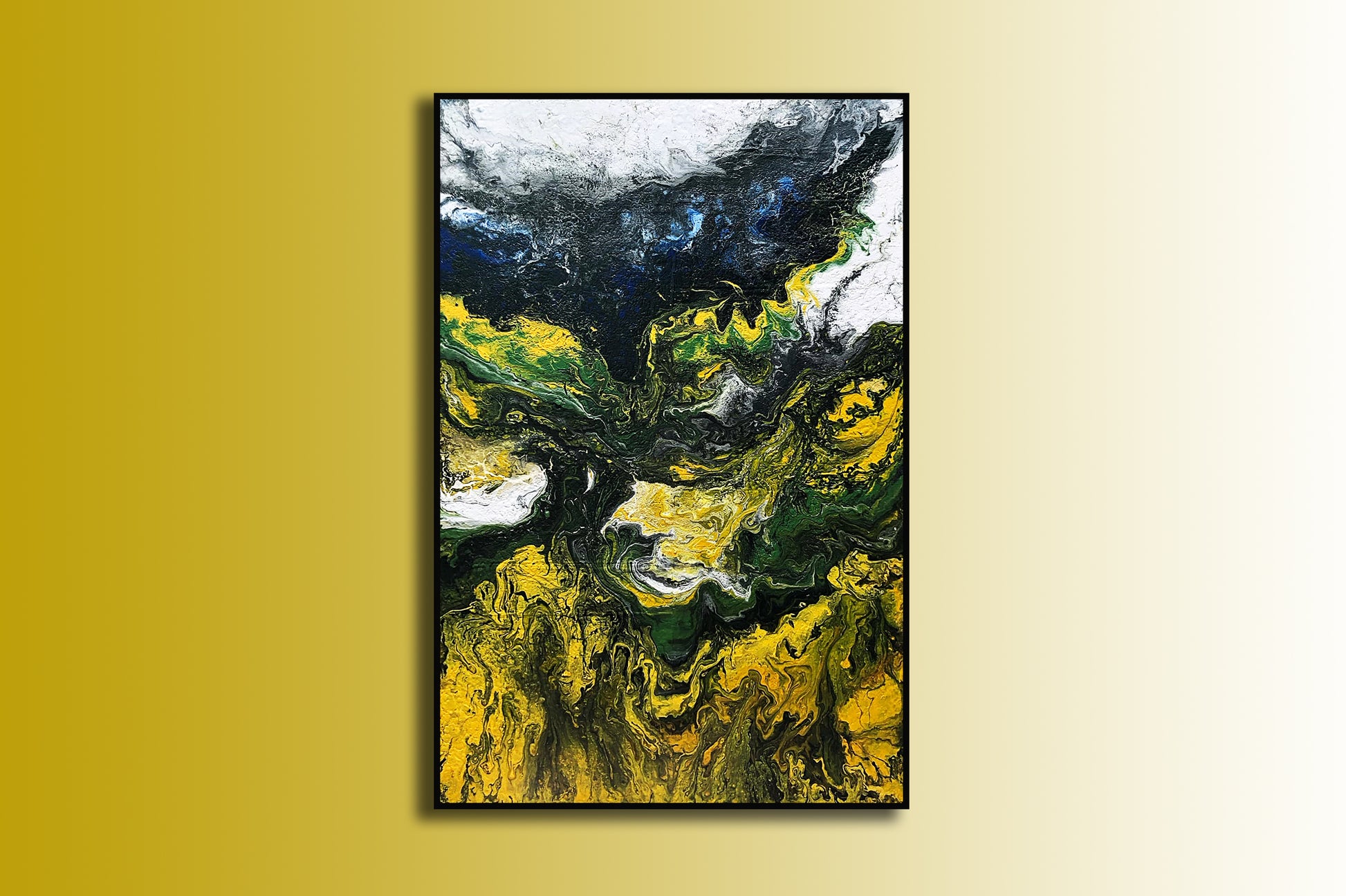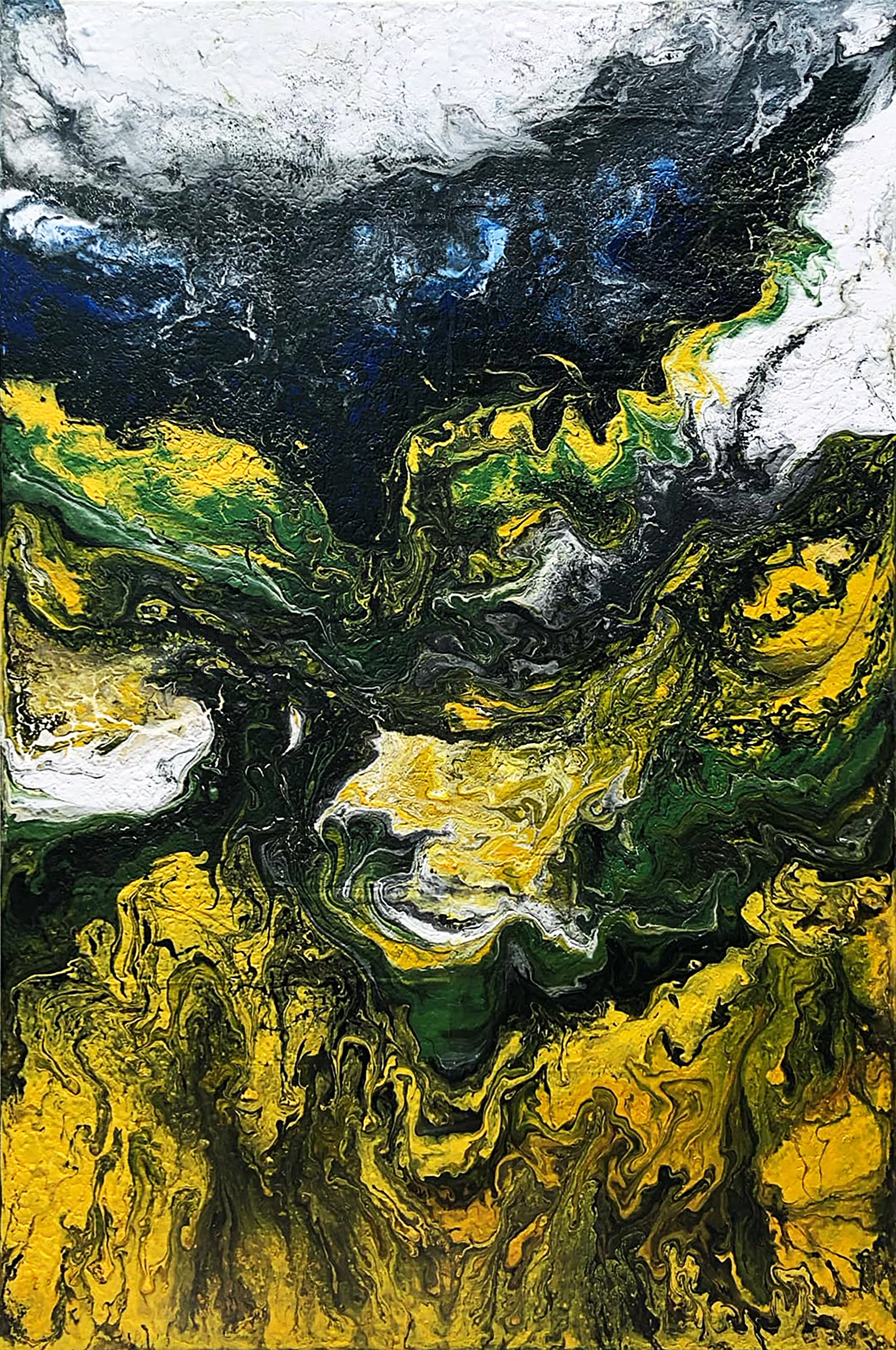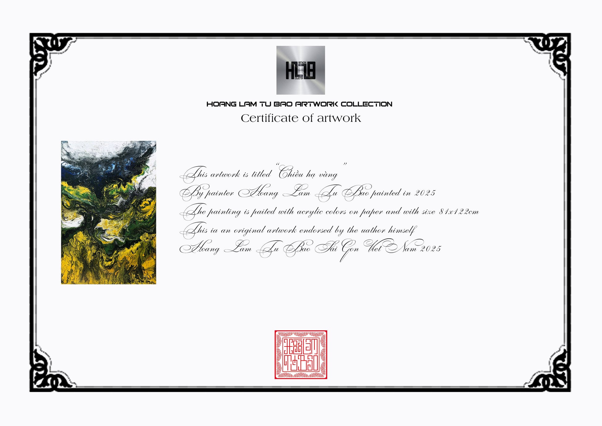 Bức tranh trừu tượng "Chiều Hạ Vàng" được Hoàng Lâm Tứ Bảo vẽ bằng màu acrylic trên giấy bồi, tái hiện vẻ đẹp của một buổi chiều mùa hạ với ánh nắng vàng rực rỡ. Những mảng màu vàng óng ả trải dài như một thảm nắng ấm áp phủ lên cảnh vật, gợi lên sự rực rỡ và dịu dàng của buổi chiều hè. Sự hòa quyện giữa gam màu xanh lá cây và trắng tạo cảm giác về những tán cây lấp lánh dưới ánh mặt trời, đong đưa nhẹ nhàng trong làn gió thoảng. Những nét vẽ mềm mại và đường nét uyển chuyển trong tác phẩm khiến người xem có cảm giác như đang bước chân vào một không gian thiên nhiên đầy sức sống. Bức tranh mang đến cảm giác yên bình, thư thái, như một lời mời gọi tận hưởng khoảnh khắc giao thoa giữa ánh sáng và bóng râm trong một chiều hè đầy thơ mộng. Bức tranh có kích thước 122x81cm