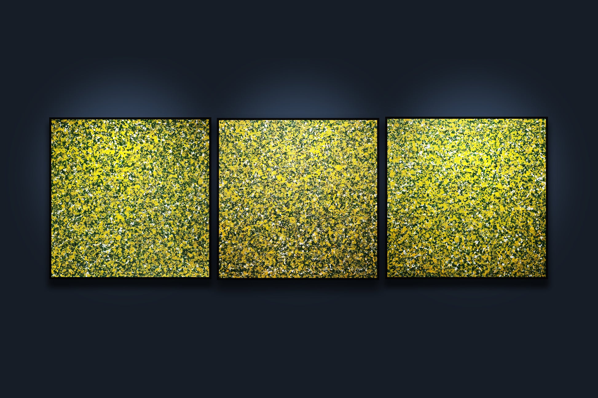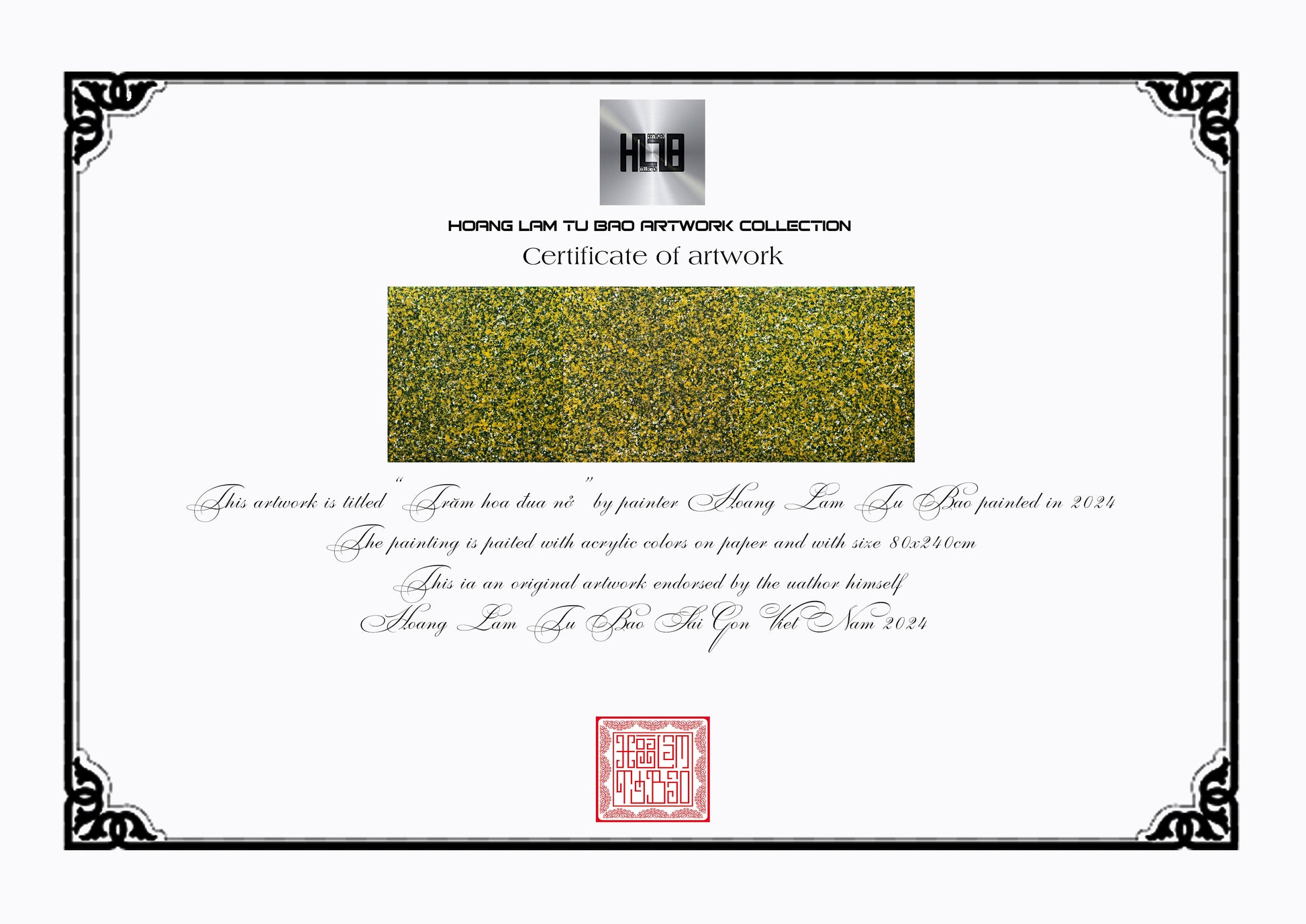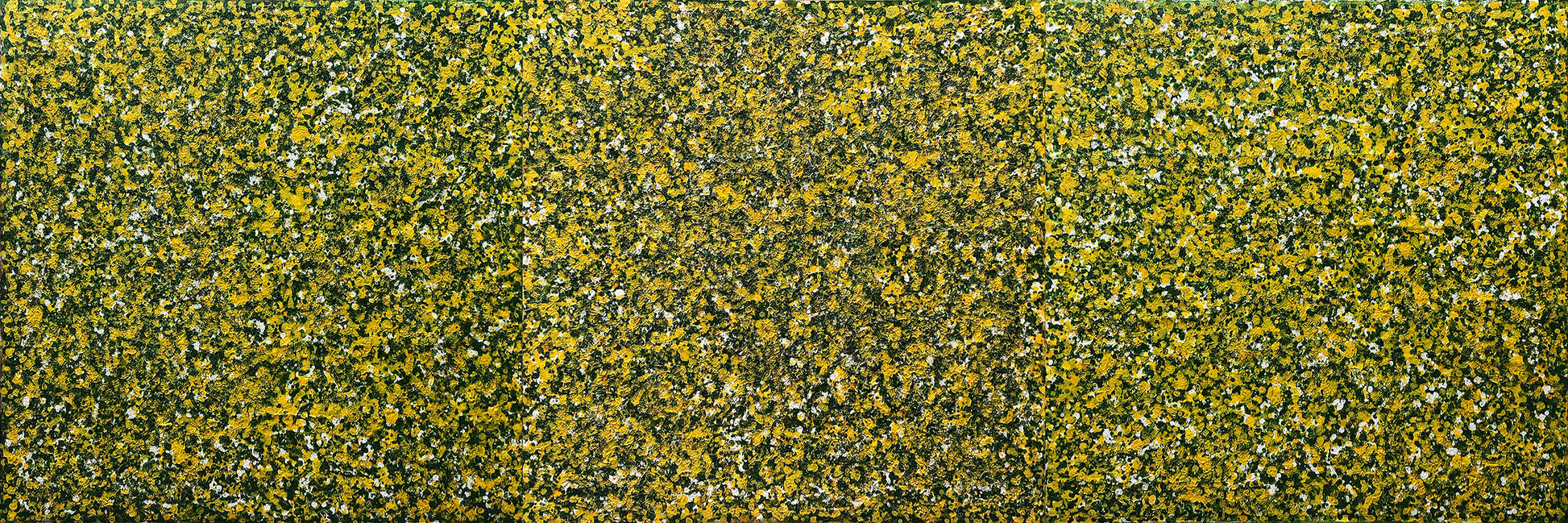 Bức tranh "Trăm hoa đua nở" là một tác phẩm trừu tượng được vẽ bằng màu acrylic trên giấy bồi, bức tranh này mô tả một cảnh tượng mùa xuân với sự nở rộ của hàng trăm bông hoa. Màu sắc chủ đạo của bức tranh là màu vàng, xanh lá cây và trắng, tạo nên một bức tranh sống động và tươi mới. Các mảng màu được sắp xếp một cách ngẫu nhiên nhưng hài hòa, tạo nên một cảm giác phong phú và đa dạng của thiên nhiên trong mùa xuân. Bức tranh không chỉ thể hiện vẻ đẹp của mùa xuân mà còn mang lại cảm giác vui tươi, tràn đầy sức sống. Bộ tam gồm 3 bức kích thước 80x240cm(80x80x3)
