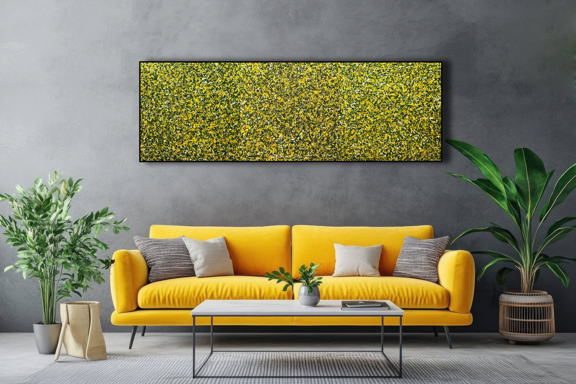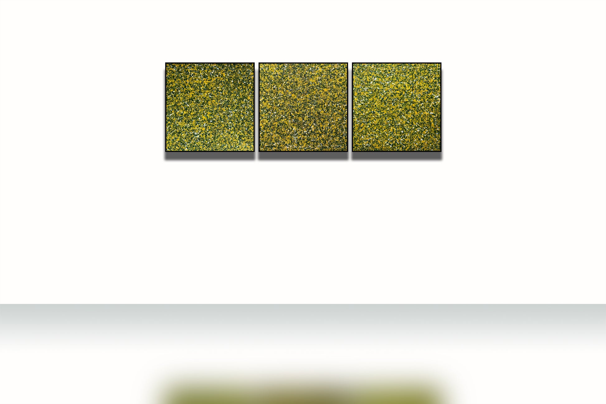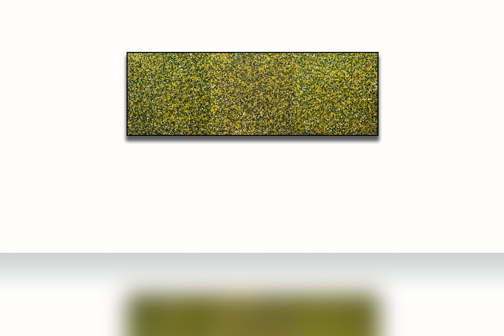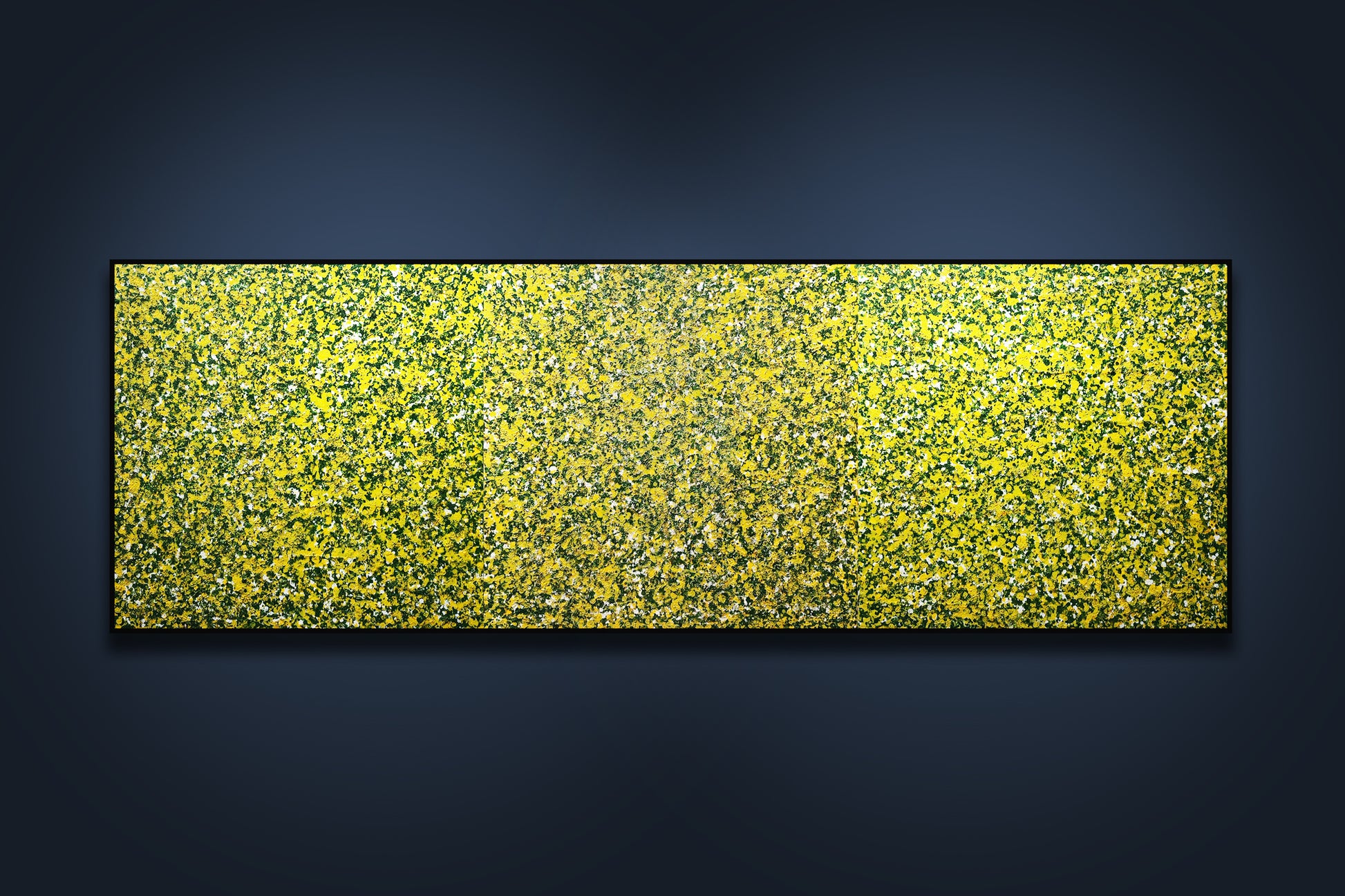 Bức tranh "Trăm hoa đua nở" là một tác phẩm trừu tượng được vẽ bằng màu acrylic trên giấy bồi, bức tranh này mô tả một cảnh tượng mùa xuân với sự nở rộ của hàng trăm bông hoa. Màu sắc chủ đạo của bức tranh là màu vàng, xanh lá cây và trắng, tạo nên một bức tranh sống động và tươi mới. Các mảng màu được sắp xếp một cách ngẫu nhiên nhưng hài hòa, tạo nên một cảm giác phong phú và đa dạng của thiên nhiên trong mùa xuân. Bức tranh không chỉ thể hiện vẻ đẹp của mùa xuân mà còn mang lại cảm giác vui tươi, tràn đầy sức sống. Bộ tam gồm 3 bức kích thước 80x240cm(80x80x3)